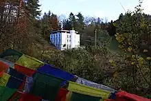 The Tibet-Institut Rikon is the only monastery outside Asia that was founded on behalf of the Dalai Lama. It was inaugurated on 9 November 1968 under the name „Kloster zum Rad der Lehre„ (literally: Monastery for the Wheel of Teaching) - but as a “Monastic Tibet Institute,” as the founding of a monastery was not permitted under the then Swiss federal constitution.[3] The Dalai Lama was also not present at the inauguration: the Federal Council banned him from entering the country.[3] He visited the monastery for the first time in 1973.[4][3] The monastic community in Rikon claims to be the only Tibetan monastery in the West.[5] The monastic Tibet Institute in Rikon was established according to the advice and under the patronage of the 14th Dalai Lama, who emphasized the importance of monasteries for Tibetan people in exile. The Dalai Lama sent an abbot and four monks to Rikon from India. The institute's buildings were designed by architect Ueli Flück (Baden AG), and the foundation stone was laid on 29 July 1967. On 9 November 1968 the monastic Tibet Institute was consecrated by the Dalai Lama's two principal teachers, Trijang Rinpoche and Ling Rinpoche,[6] under the name "Kloster zum Rad der Lehre" (literally: Monastery for the Wheel of Teaching).[4] On 8 April 2010 the 14th Dalai Lama visited the monastery community in Rikon for the 14th time, and was warmly received by Tibetan people, on the occasion of the 50th anniversary of the establishment of Tibetan refugees in Switzerland.[7] The 14th Dalai Lama visited the monastic community again in 2013, 2015 and 2016.[6]