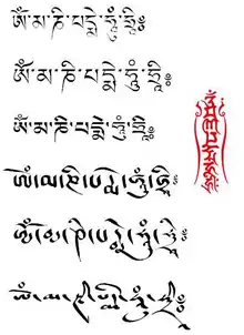 • The Uchen (དབུ་ཅན།, "headed"; also transliterated as uchan or dbu-can) style of the Tibetan script is marked by heavy horizontal lines and tapering vertical lines, and is the most common script for writing in the Tibetan language, and also appears in printed form because of its exceptional clarity. It is believed to have been carved on wooden slabs.[2] The Uchen system was developed in the 9th century by scholar Khyungpo Yutri. The Clear, Precious Box (Yi-ge'i thig-ris gsal-ba'i rin-chen sgrom-bu) written by Yutri's student, Rongpo, was a handwriting manual of the Uchen style. Desi Sangye Gyatso would later write a commentary on The Clear, Precious Box, which established the basis of the use of Uchen script.[3] Uchen was designed as a formal script used by scholars and members of educated society to record important documents.[4]