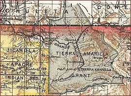 The Tierra Amarilla ("Yellow Land" in Spanish Land Grant is about 40 mi (64 km) from north to south and 25 mi (40 km) east to west, occupying a large portion of Rio Arriba County, New Mexico and a small portion of Archuleta County Colorado. The land begins at the Rio Nutrias in the south and extends northward to the south San Juan Mountains of Colorado. Most of the land is mountainous. The lower elevations are semi-arid and vegetation is grassland and Pinyon pine woodland. Conifer forests are found at higher elevations. Elevations on the grant range from 6,653 ft (2,028 m)[4] at the junction of the Nutrias with the Rio Chama in the south to 12,778 ft (3,895 m) at Banded Peak in Colorado.[5] Two small towns are in the grant area: Tierra Amarilla (population 297 in 2020) and Chama (population 917). Chromo is a community at the edge of the grant in Colorado.[6][7] The former town of El Vado, which in 1910 had a population of 1,000, is now beneath the waters of El Vado Lake.[8]