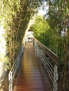 Bamboo-lined entrance bridge.