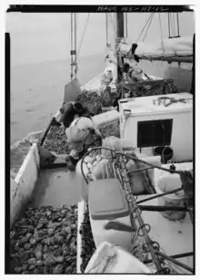 When the Chesapeake Bay area was first settled in the 1600s, it was a bountiful source of fish and other seafood. The area around Tilghman Island had particularly rich oyster beds. Watermen earned their livelihood from a variety of tasks: crabbing, oystering, tonging and dredging, seafood packing and canning, and guiding hunting parties. The maritime industry of shipbuilding became established on the island, and several types of boats developed for use in local conditions.[3] Log canoes with sails, adapted from the canoes of Powhatan tribes, are local to the area.[4] So are skipjacks, two-masted sailboats used for oystering on Chesapeake Bay. Skipjacks have remained the primary boat for oystering due to a Maryland law banning the use of motors for oystering.[5]