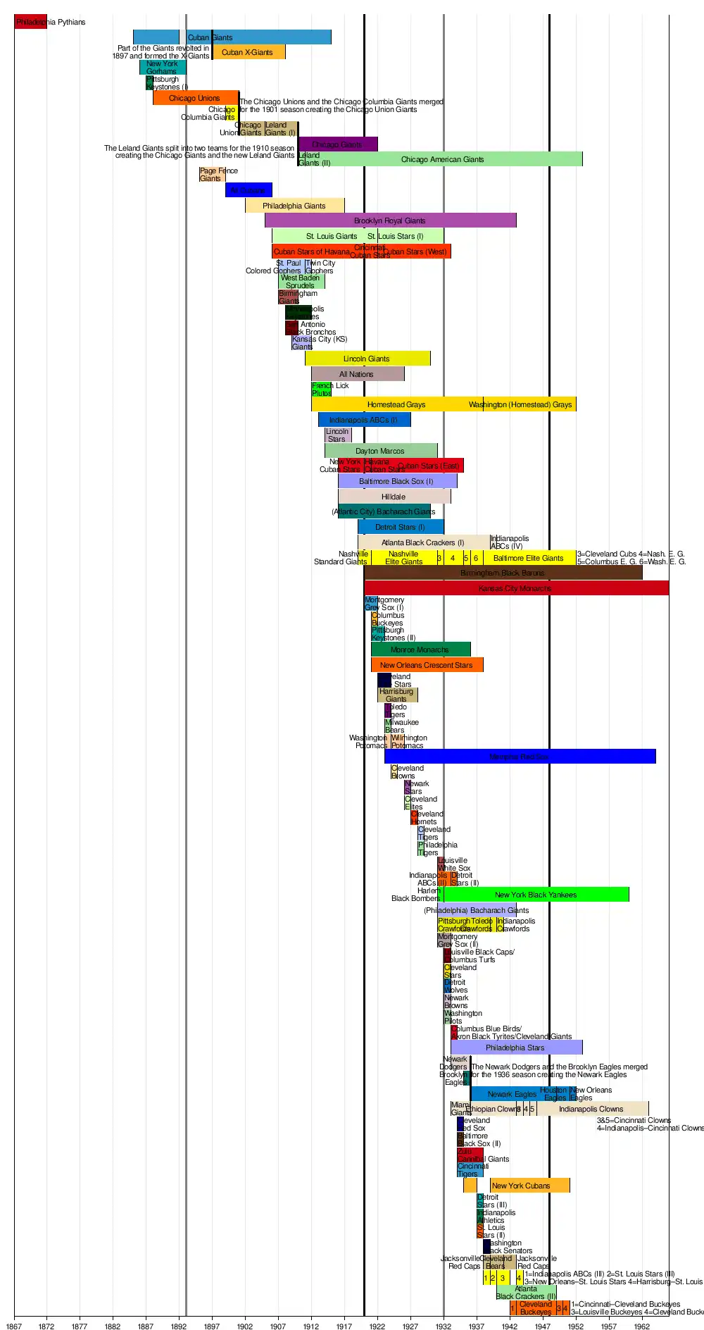 The two thick gray lines represent trying times: the first is the Panic of 1893 and the second is the Great Depression in 1933. Both crisis led to financial ruin and collapse of most teams and leagues. The two thick black lines represent the formation of organized league play in 1920 and the integration of Major League Baseball in 1946. After integration, the level of play deteriorated rapidly and dramatically. By 1950 all teams were considered to be of minor league status.
