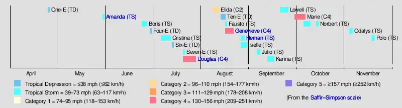 The formation of One-E on April 25 marked the earliest start to a Pacific hurricane season on record. However, seasonal activity as a whole was generally below average. The season featured 16 named storms, in line with the 1981–2010 long-term average of 15. It featured just four hurricanes, or half the average. Three of those hurricanes intensified into major hurricanes,[nb 2] which compares to the average of four. A few storms produced substantial impact to land in 2020. In May, Tropical Storm Amanda caused widespread damage and killed numerous people in El Salvador, Guatemala, and Honduras.[3] In August, the remnants of Tropical Storm Fausto sparked devastating wildfires across Northern California,[4] while Genevieve produced hurricane-force winds and caused additional fatalities in the Baja California peninsula.[5] Lesser but still deadly effects were produced there by Tropical Storm Hernan as well.[6] A month prior, Hurricane Douglas passed very close to Oahu, though it caused only minor impact.[7]