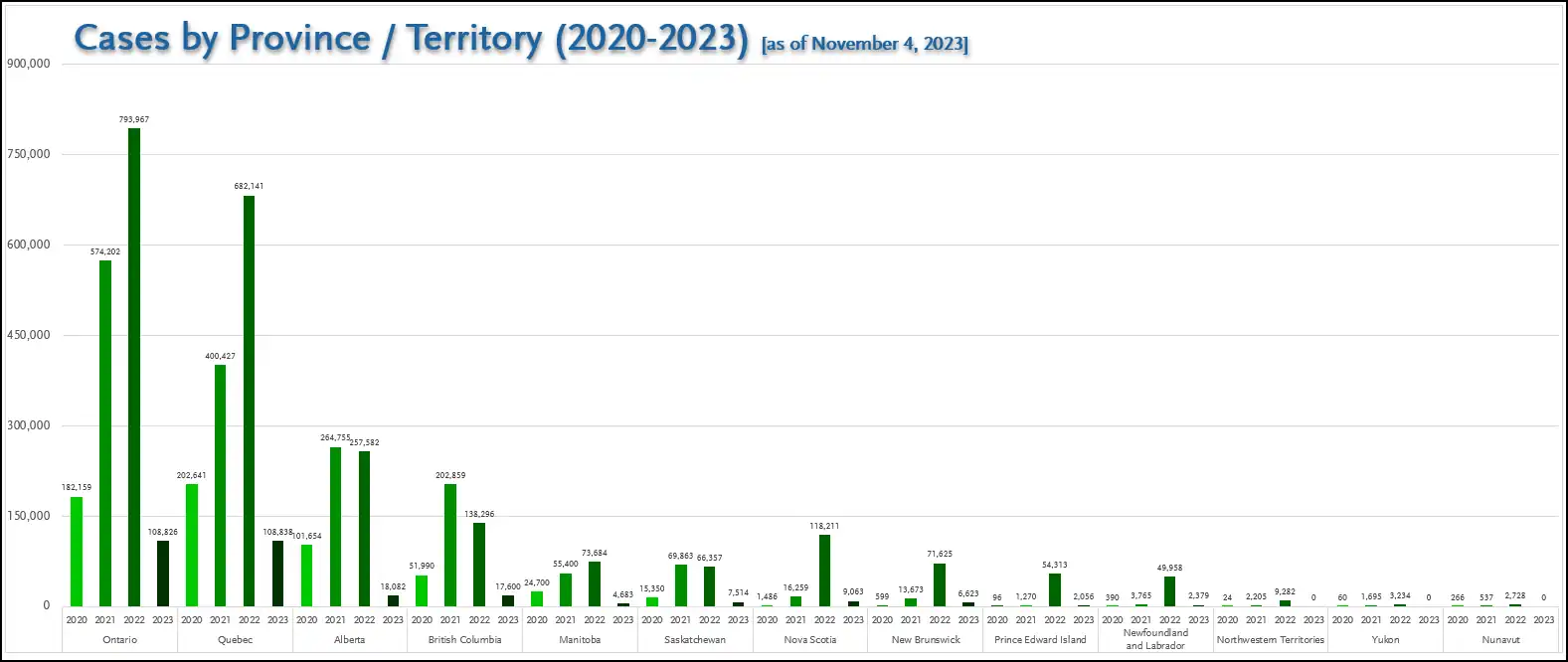 | Province / Territory | Total cases | New cases in 2020 | New cases in 2021 | New cases in 2022 | New cases in 2023 | ||||