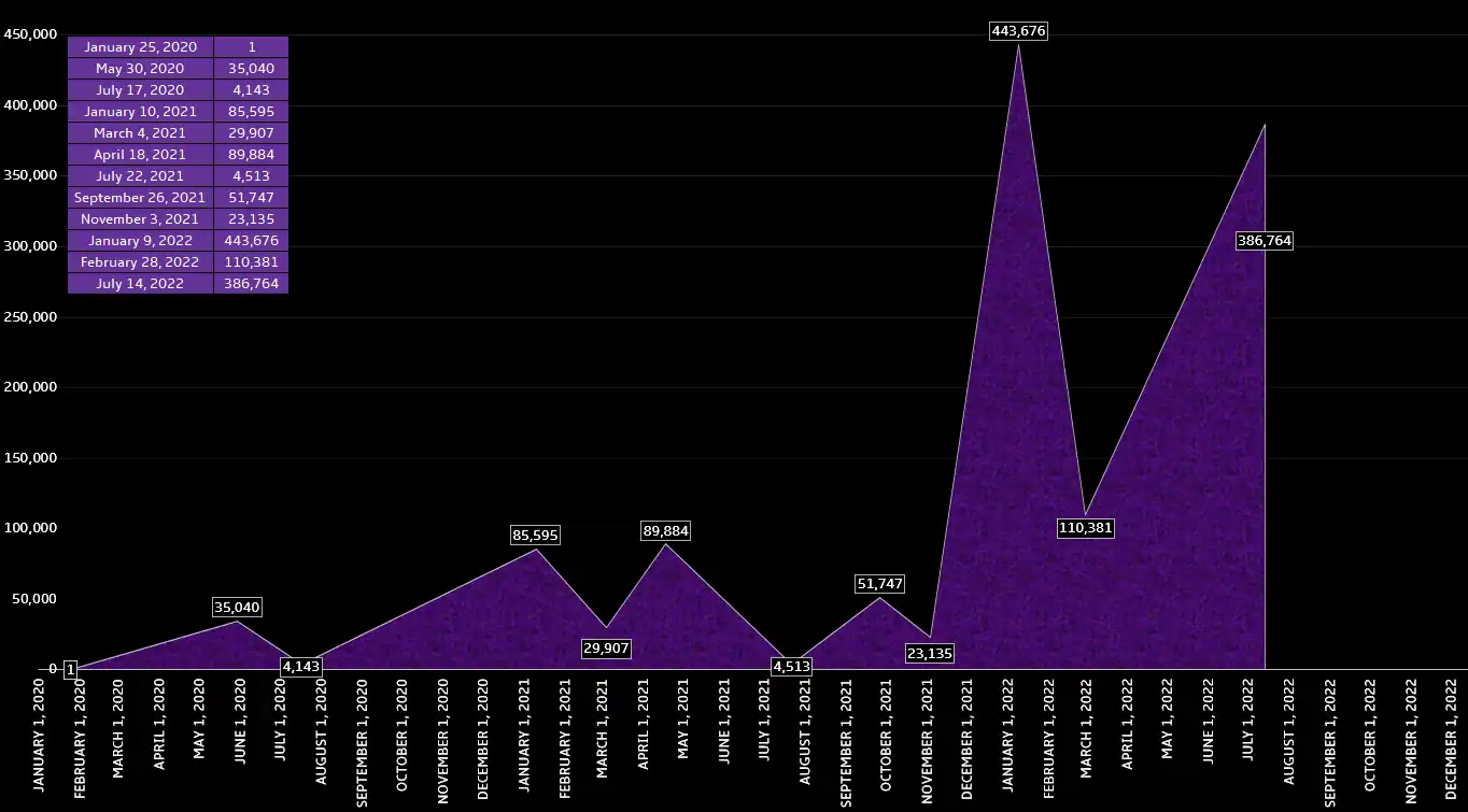 | Peak (67 days after the start) | January 9, 2022 | 443,676 | |||