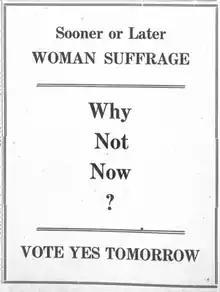 - During the 1912 election, suffragists position themselves at the polls and remind voters to vote for candidates who endorse women's suffrage.[3]