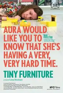 Tiny Furniture is a 2010 American comedy-drama film written, directed by, and starring Lena Dunham. The film premiered at South by Southwest, where it won the award for Best Narrative Feature,[3] screened at such festivals as Maryland Film Festival, and was released theatrically in the United States on November 12, 2010. Dunham plays Aura, an aimless, jilted film school graduate who returns home on what she hopes is a temporary basis. Dunham’s mother, artist Laurie Simmons, plays Aura’s mother, while her real sibling, Cyrus Grace Dunham, plays Aura’s on-screen sister. The actors Jemima Kirke and Alex Karpovsky would also appear in Dunham's television series Girls.