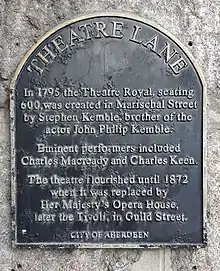 A plaque erected by Aberdeen City Council at Theatre Lane states: "In 1795 the Theatre Royal, seating 600, was created in Marischal Street by Stephen Kemble, brother of the actor John Philip Kemble. Eminent performers included Charles Macready and Charles Keen. The theatre flourished until 1872 when it was replaced by Her Majesty's Opera House, later the Tivoli, in Guild Street."