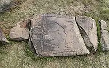 The Gurage stelae are of three types: anthropomorphic stelae with human figures, phallic stelae, and stelae of neither anthropomorphic nor phallic type. The anthropomorphic and non-anthropomorphic/non-phallic stelae types are flat in shape, being the only stelae of this form in the southern region.[2] Most of these stelae, including the 46 ones at Tiya, which are the largest of the bunch, also have distinctive, elaborate decorations.[2][3] Among these designs are swords, plant-like symbols, and a standing human figure with arms akimbo. The plant and sword emblems can be found on the same stelae.[2] The sword design is reportedly of local "Galla" type, as made by the Oromo. In addition, the Tiya rock slabs also often feature a T-shaped symbol.[7][8][9][10]