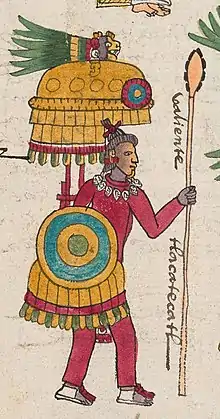 A tlacateccatl pictured in the Codex Mendoza (folio 67 recto). He is brandishing a shield (chimalli) and a lance (tepoztopilli), wears dyed cotton armour, and has a banner (pamitl) on his back