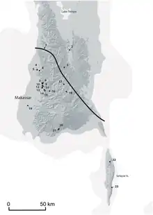 The earliest peopling of Sulawesi is considered to be related to a wave of migration through Indonesia around 45 thousand years ago, during which some people stayed in the area while others continued to eventually reach Sahul.[11] A number of related Pleistocene sites in the area are known for their rockart.[12][13] These sites predate the Toalean culture, and an absence of archaeological sites dated to the intervening period between 12-8kya prevent a direct link.