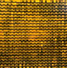 Williamson's paintings are structured color compositions, effected by the abstract expressionism, and an enhancement of the Color field painting. While the color field painting is marked by large-scale, homogeneously filled fields, Williamson interprets this style in a new manner: His works are mostly composed of multilayered color grids which differentiate themselves symmetrically of each other or go over into each other.[4] He does this by using a variety in thickness of paint as well as a series of lines and grids which create a framework to control the chaos and emotion of the painted color-fields, creating an ethereal and multi-layered surface. The borders which are typical for the color field painting become blurred; to its place steps the impression of the complete works which connects the structure of the underground with the play of the colors.