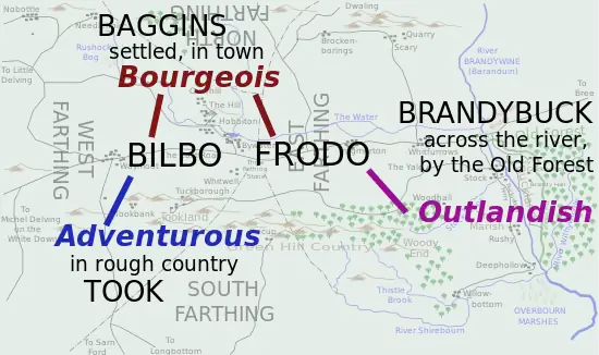 Bilbo's and Frodo's ancestry analysed by geography of the Shire and Hobbit family character. Bilbo inherits bourgeois Baggins and adventurous Took, suiting him both for life in the Shire and for the adventure described in The Hobbit. Frodo inherits bourgeois Baggins and outlandish Buckland, suiting him for the quest of The Lord of the Rings, but leaving him ultimately unsettled.[32]