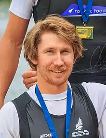 At the 2019 New Zealand rowing nationals, he competed in three premier boat classes. Partnered with Wilson, he retained his national title in the coxless pair. With the eight, he won bronze, and with the coxless four, he came fifth.[24] Continuing to row internationally with Brake, they won silver at World Rowing Cup II in Poznań and bronze at World Rowing Cup III in Rotterdam, Netherlands. At the 2019 World Rowing Championships in Linz-Ottensheim, Austria, they won silver, beaten by the Sinković brothers for gold.[6] This result qualified this boat class for the 2020 Tokyo Olympics.[25]