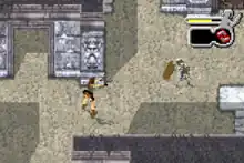Unlike previous handhelds in the series such as the Tomb Raider: Curse of the Sword, which played in a side-scrolling two-dimensional form, reminiscent of 8-bit games, The Prophecy instead plays in an isometric viewpoint, giving the player a viewpoint from above the player character's head.[1] The game contains many familiar elements of the franchise such as being able to jump, run, climb and shoot. As the game was the first Tomb Raider to be rendered in an isometric view until Lara Croft and the Guardian of Light, the game was also given a new combat system to suit the view style. The system does not include the regular player-controlled lock on gun play of previous games. It does instead contain an auto-lock system to make combating enemies easier. There are three weapons that the player can use: Lara's signature handguns, Uzi pistols and golden guns. The controls were designed to be simple, with the directional pad assigned to movement, the A button is used as a jump button, the R button pulls out or holsters weapons, and the L button allows the player to sprint.
