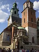 From 1972 to 1973, the Cathedral authorities undertook work to renovate the Holy Cross chapel.[10] As part of this project, permission was given by the Archbishop of Kraków, Karol Wojtyła – the future Pope John Paul II – to open the tomb of Casimir and Elizabeth in May 1973.[7][11][12] The work was undertaken by a team of 12 conservationists and their initial aim was to examine the contents of the tomb in order to assess how best to renovate it. When the tomb was opened, the team found rotting wooden coffins and the remains of Casimir and Elizabeth.[12] The restoration work was then carried out and, once it had been completed, Casimir and Elizabeth were re-interred in a ceremony held in the cathedral on 18 September 1973,[10] with Archbishop Wojtyła conducting the service.[13]