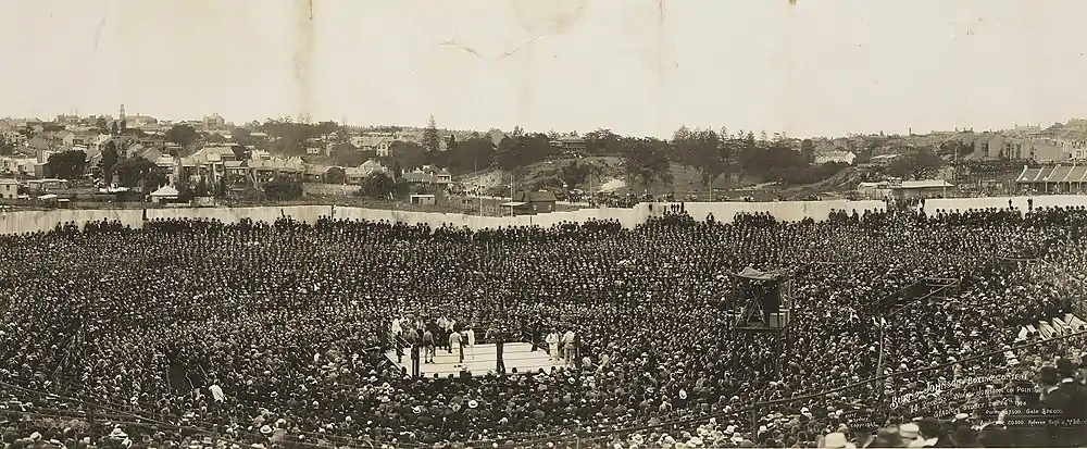In December 1908, after months of delaying arranging the fight, Burns agreed to a bout with Jack Johnson and became the first fighter to hold to a heavyweight championship bout with an African American. Burns lost his title in the match held in Sydney. The fight was ended in the 14th of 20 three minute rounds with Burns failing to land a punch, and being clearly unable to continue.[3] He had refused to fight Johnson until Australian promoter Hugh D. McIntosh paid him $30,000 for the fight (Johnson received $5,000).[4] Burns was rumoured to be suffering from the effects from jaundice or influenza, and weighed in at 168 pounds (76 kg)—15 pounds (6.8 kg) lighter than his previous fight, and well below Johnson's 192 pounds (87 kg). The fight lasted fourteen rounds before being stopped by the police. Burns later claimed the disruption was due to spectators' concern he had a broken jaw. He also stated numerous right uppercuts from Johnson led to swelling on his face and the request to stop the fight.[5] Referee Hugh McIntosh awarded the decision and the title to Johnson.