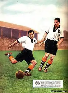 Lawton was widely regarded as the finest centre-forward of his generation.[92] He boasted a strong physique and good ball control skills, as well as a great passing range and a powerful shot.[93][94] He was naturally right-footed, though worked to improve his left foot to a good enough standard to be considered a two-footed player.[95] His greatest strength though was his ability to head the ball with power and accuracy, as he possessed muscular legs to give himself a strong jump and long hang-time, and was also able to time his jumps to perfection.[94][96] Stanley Matthews surmised that "Quite simply, Tommy was the greatest header of the ball I ever saw."[97] Lawton was never booked throughout his career.[98][99]