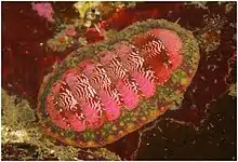 Tonicella insignis, the white-lined chiton, or red chiton, also known as the hidden chiton, belongs to the Tonicellidae family in the class Polyplacophora, and the phylum of Mollusca.[1][2] Its body length of T. insignis is around 5 cm.[3]