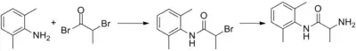 - ↑ DE 2400540, Boyes RN, Duce BR, Smith EM, Byrnes EW, "Primaeraminoacylanilide, Verfahren zu Deren Herstellung und Sie Enthaltende Arzneimittel", issued 1974, assigned to Astra Pharmaceutical Products Inc.