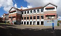 Toowoomba East SS, opened on 17 January 1887, was established on a 2.5 acre (1ha) reserve for a National School at the corner of Mary Street and Margaret Street, which had been gazetted in 1872.[9][10][11][12] Although there was local pressure for a school in East Toowoomba from 1876, when fund raising by the community began, the population was not large enough to justify a state school. As a result of later population growth, the Queensland Government approved a school in East Toowoomba in October 1885. By this time the community had collected £200 of the £290 required as its one-fifth share of the £1433 construction cost, and the school was also initially referred to as Queen's Park State School. The school consisted of a timber building set on brick piers, with two classrooms, close to the corner of Mary Street and Arthur Street. It was designed to accommodate 250 students, and had admitted 235 students by February 1887.[13][14][15][16][17][18][1]