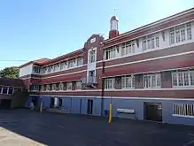 Construction of the Depression-era brick school building (Block A in 2017) at Toowoomba East SS occurred during 1935–36, for a cost of £16,326.[43][44][45][46][47] The new building was sited parallel to, and facing, Arthur Street, after relocation of the old timber buildings. As the new building was only designed for 640 students, and enrolment was 1000 by the time it was officially opened on 8 May 1937 by James Kane, the Member of the Queensland Legislative Assembly for East Toowoomba, it was necessary to retain at least four of the old timber buildings. These were relocated at a distance behind the new brick building to form a parade ground between them. The school residence was removed c. 1936.[48][49][50][51][1]