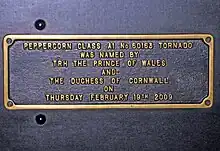 On 19 February 2009, Tornado was officially named by the Prince of Wales, accompanied by the Duchess of Cornwall and Dorothy Mather, Peppercorn's widow, at York railway station. The ceremony is marked by a plaque located below the nameplate. Tornado then pulled the Royal Train to Leeds.[13]