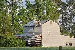 As the tornado crossed MS 39, it continued causing extensive tree damage, with large swaths of land where nearly every tree was snapped, many of which were debarked. In addition, a site-built home suffered heavy roof and structural damage, another home sustained heavy roof damage, and several outbuildings were destroyed. Here, the tornado reached its maximum width at 3⁄4 mile (1.2 km), before weakening and narrowing a little and crossing Mississippi Highway 16 again, just west of Scooba. Numerous trees and a couple of power poles were snapped in this area. The tornado then crossed US 45 to the south of Scooba with a relatively narrow but intense damage swath that was rated high-end EF2 to low-end EF3. A large warehouse building was completely destroyed, three homes sustained roof damage, and a pickup truck was thrown a considerable distance. More intense tree damage occurred in this area with debarking and denuding. The tornado widened again east of Scooba, causing heavy damage along Mississippi Highway 16 near Giles Road. Several homes sustained heavy roof damage, power poles were snapped, and more trees were denuded. About 3200 acres of pine and hardwood forest were damaged in Kemper County.[26]