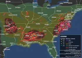 ![]() Map of tornado warnings and confirmed tornadoes from the outbreak. | |
