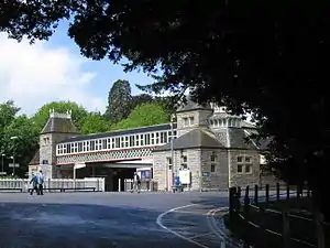 The station has two ranges of buildings, each 244 feet (74 m) long, built in local grey rubble stone on either platform. Deep canopies on composite iron and wood girders cover the platforms; there are further canopies on the road side of both buildings. the building which faces the sea at Abbey Sands and the town is used and this houses the ticket office and a café; the gate from this approach road is open when trains are running.[9] The one remaining signal box (now rented out for commercial purposes) is situated at the south end of this platform near a decorative cast iron bridge across the tracks. The station buildings are Grade II listed.[1]