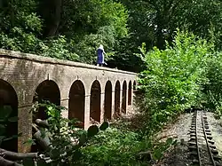 The Torry Hill Railway was built in the 1930, as many British narrow gauge estate railways. It is maintained and occasionally operated by a group of volunteers. There is still a turntable, a 100 ft (30 m) long tunnel and a viaduct that has been built from realistically scaled miniature bricks. It is owned by the heirs of Sir Robert Leigh-Pemberton, Baron Kingsdown.[1]
