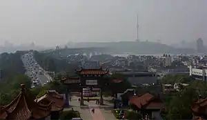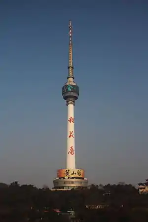 Tortoise Mountain TV Tower (Chinese: 龟山电视塔; pinyin: Guī Shān Diànshì Tǎ) is a 311.4 metres (1,022 ft) high TV Tower in Hanyang District, Wuhan, Hubei, China. It is a concrete tower equipped with an observation deck in a height of 221.2 metres (726 ft). It does not stand directly upon the hill, which is occupied by an ancient temple complex (Qing Chuan Ge (晴川閣) from the Three Kingdoms, Song, and Ming Dynasties). Guishan TV Tower is China's first self-developed TV tower, opened in 1986.