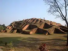 Mahasthangarh is one of the earliest urban archaeological sites so far discovered in Bangladesh. The village Mahasthan in Shibganj thana of Bogra District contains the remains of an ancient city which was called Pundranagara or Paundravardhanapura in the territory of Pundravardhana.[27][28][29] A limestone slab bearing six lines in Prakrit in Brahmi script, discovered in 1931, dates Mahasthangarh to at least the 3rd century BC.[30] The fortified area was in use until the 18th century AD.[28]