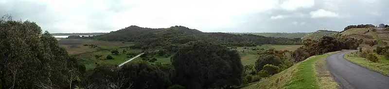 Tower Hill is an inactive volcano on the south-west coast of Victoria, Australia, approximately 275 kilometres (171 mi) west of Melbourne, and 15 kilometres (9 mi) north-west of Warrnambool. The Tower Hill crater is roughly 3 kilometres (2 mi) wide and 80 metres (260 ft) high, with a gradient of between 10% and 80% at the higher points. Within the crater, a series of later volcanic explosions formed a number of scoria cones and spheres, surrounded by a crater lake. Being a giant nested maar, Tower Hill is of international geological significance. The Dhauwurdwurrung name for the volcano is Koroitj.[1]