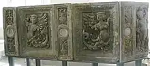 The Town Hall Staircase erected in 1537 by Wendel Roskopf is a masterpiece of the early Renaissance in Germany.[1]: 344 The curved staircase leads up to the portal of the courthouse wing and the pulpit, which was built at the same time. The latter rests on the side of the staircase on a pair of columns with a constricted shaft. The sculptor Andreas Walther I decorated the staircase with patterns unusual for that time. On of them shows Adam and Eve in the fall. Putti using the banister as a slide are found next to Siren that fill the decorative fields of the pulpit. The original reliefs were replaced by copies in 1950. They are now located inside the building, sheltered from erosion.