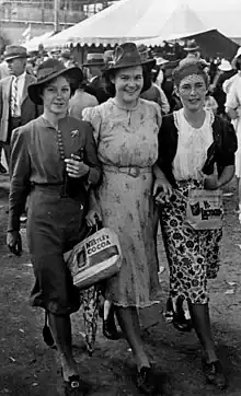 Three young women dressed up for a day at the Townsville Show, 1941