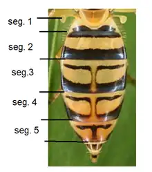 The abdomen is mostly black, with a yellow base and sides on the first segment. The second segment has a broad, entire yellow cross-band on the median. The female's third and fourth segments have a narrow yellow border at the front and a thin line passing through narrow interruptions of the broad yellow cross-bands. The fifth segment is yellow, except for two rectangular, parallel, and more or less connected black spots. The male's third and fourth segments are yellow or yellowish red, except for a pair of black lines on each side, resembling the sides of a square and being more or less indistinct. The fifth segment and the hypopygium are entirely yellow. [3][4] [5]