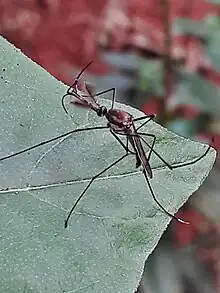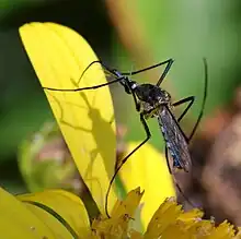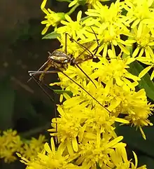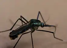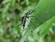 Toxorhynchites, also called elephant mosquito or mosquito eater, is a genus of diurnal and often relatively colorful mosquitoes, found worldwide between about 35° north and 35° south. Most species occur in forests. It includes the largest known species of mosquito, at up to 18 mm (0.71 in) in length and 24 mm (0.94 in) in wingspan.[1] It is among the many kinds of mosquito that do not consume blood. The adults subsist on carbohydrate-rich materials, such as honeydew, or saps and juices from damaged plants, refuse, fruit, and nectar.[2]