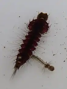 In contrast to blood-sucking species of mosquitoes, their larvae prey on the larvae of other mosquitoes and similar nektonic prey, making Toxorhynchites beneficial to humans.[1] Living on this protein and fat rich diet, females have no need to risk their lives sucking blood in adulthood, having already accumulated the necessary materials for oogenesis and vitellogenesis. The larvae of one jungle variety, Toxorhynchites splendens, consume larvae of other mosquito species occurring in tree crevices, particularly Aedes aegypti.