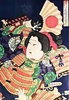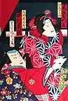 Toyohara Kunichika (Japanese: 豊原 国周; 30 June 1835 – 1 July 1900) was a Japanese woodblock print artist. Talented as a child, at about thirteen he became a student of Tokyo's then-leading print maker, Utagawa Kunisada. His deep appreciation and knowledge of kabuki drama led to his production primarily of yakusha-e, which are woodblock prints of kabuki actors and scenes from popular plays of the time.