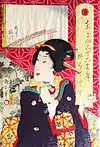 An alcoholic and womanizer, Kunichika also portrayed women deemed beautiful (bijinga), contemporary social life, and a few landscapes and historical scenes. He worked successfully in the Edo period, and carried those traditions into the Meiji period. To his contemporaries and now to some modern art historians, this has been seen as a significant achievement during a transitional period of great social and political change in Japan's history.[1]