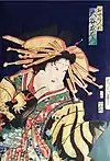 Kunichika often portrayed beautiful women (bijinga), but his finest works are considered to have been bust, half- and three-quarter length, and close-up or "large-head" portraits of actors, and triptychs that presented "wide-screen" views of plays and popular stories.[14]