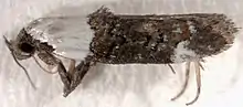 Male, female.— 14-17 mm. Head, palpi, and antennae dark fuscous. Thorax white, anterior margin dark fuscous. Abdomen fuscous. Legs dark fuscous, apex of tarsal joints obscurely pale. Forewings elongate, costa arched towards base and apex, rest nearly straight, apex round-pointed, hindmargin very obliquely rounded ; dark fuscous ; a large white basal patch, slightly ochreous-tinged, outer edge slightly irregular, extending from 14 of costa to before middle of inner margin ; a small elongate blackish spot on base of costa ; two large spots of raised ochreous-brown scales, partially black-margined, in disc before middle, and two smaller ones beyond middle ; a small somewhat triangular inwardly oblique white spot on costa at 45 , emitting from its apex a slender white outwards-angulated line to hindmargin above anal angle, anteriorly blackish-margined : cilia fiasco as-grey, with an obscure darker line. Hindwings fuscous-grey, darker towards apex ; cilia fuscous-grey, with an obscure darker line.[3]