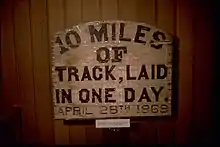 The ten-mile rail segment laid in 1869 (and the Promontory Golden Spike site) was bypassed in 1903 with the completion of the Lucin Cutoff,[22] although service continued for several years on the original route, which the Southern Pacific called its Promontory Branch.[23][24] The abandoned rails were eventually taken up for scrap and reuse in 1942.[25][26] At the Golden Spike National Historical Park, the West Auto Tour is a 7-mile (11 km) route that takes tourists to a replica of the sign erected by the CP at the site to commemorate the April 28 record.[27] The original sign is thought to be in the Utah State Capitol building in Salt Lake City; a replacement sign that may have stood at the site is on display at the visitor's center in Promontory, and a replica is displayed at the California State Railroad Museum in Sacramento.