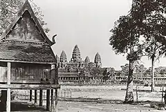 The earliest record of Cambodian housing is from the Chinese record of Funan kingdom (1st-7th century AD) where the residents were described as people who lived on stilt houses, cultivated rice and sent tributes of gold, silver, ivory and exotic animals.[2] The people built their houses over the ground and made them accessible by ladders as seen across Cambodia today. The Chinese accounts also mentioned the walled towns, dwelling houses and palaces.[3]