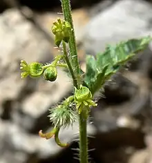 Tragia ramosa is a perennial herb growing mostly erect, measuring 10 to 30 centimeters in maximum height. It is covered in long, rough stinging hairs.[2] The leaves have lance-shaped or oval blades with toothed edges, which are borne on petioles.