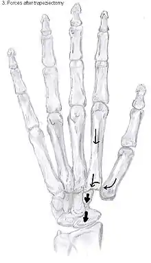 - ↑ Mureau MA, Rademaker RP, Verhaar JA, Hovius SE (September 2001). "Tendon interposition arthroplasty versus arthrodesis for the treatment of trapeziometacarpal arthritis: a retrospective comparative follow-up study". J Hand Surg Am. 26 (5): 869–76. doi:10.1053/jhsu.2001.26659. PMID 11561240.