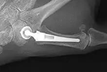 Subluxation of a prosthesis is a complication where the prosthesis is mobile and is partially dislocated. When the prosthesis is fully dislocated it is called a luxation. Both are painful and need revision surgery so the prosthesis can be repaired or removed.[37] When using a prosthesis over a longer period of time, there is a chance of breaking the prosthesis itself. This is due to mechanical wear.