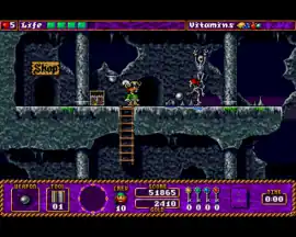 Flynn starts with a life meter of five units (which can be extended) and three extra lives. Touching enemies, enemy projectiles or environmental hazards (poison, spikes) will reduce the life meter depending on the specific enemy. When the life meter reaches zero Flynn will lose a life, the game ends when the last life is lost. The game has four stages and the player will be given a password between each of them which can be used to continue a game after shutting it off or losing all of the lives. However, the password only provides level access and does not save any score or other inventory items. The life meter can be filled by picking up potions or buying food. Additionally Flynn can pick up fruit from defeated enemies and pots which fill a "Vitamins" gauge which, when full, is reset to zero and rewards one life point.