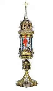 The large gilded reliquary has been the custody of the Illustrious Relic since 1532, when the upper reliquary was added. The lower pedestal, on the other hand, as mentioned, was made in the second half of the 15th century by Bernardino delle Croci as a support for the relic during processions. It is a very fine work of sculpture and jewelry 44.5 centimeters high and 21.5 wide at the base, made of gold, silver and enamels, all studded with a variety of gems and precious materials.[22]